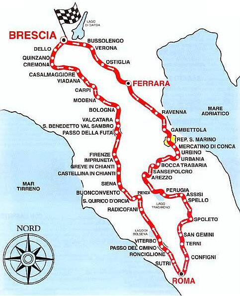 Zwischen 1927 und 1957 kämpften die Rennteams um die schnellste Zeit von Brescia nach Rom und zurück. Die Route führt auch heute noch über öffentliche Straßen.